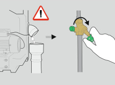Die Trinkwasserzufuhr ist die Leitung, welche auf der linken Seite recht weit oben zum Modul führt. Bei der Montage des Regenwassermoduls wurde sicherlich in diese Leitung eine Absperrmöglichkeit eingebaut. Schließen Sie diese Absperrvorrichtung, indem Sie zum Beispiel ein grünes Rad ganz fest zudrehen, oder einen Hebel so stellen, dass er quer zur Leitung steht.